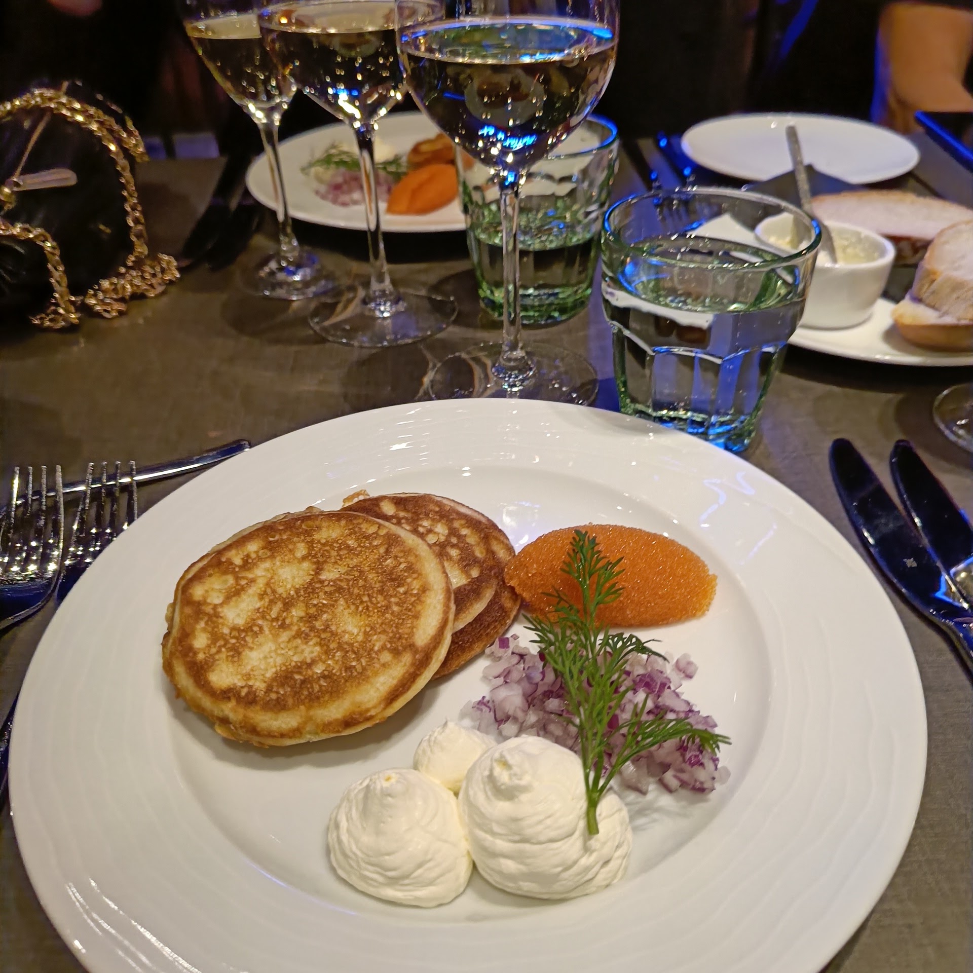 Alkuruuaksi oli ihastuttavia miniblinejä muikunmädillä Saimaalta ja punasipulia sekä smetanaa. Blinit olivat herkullisen kuohkeita ja ilmavan kevyitä, johon raikas muikunmäti, punasipuli ja smetana toimivat hyvin. Alkuruuan pariksi oli valittu yllättäen Jean Leon Chardonnay, joka toimi erinomaisesti raikkaalla hedelmällisyydellään ja hapokkuudellaan.