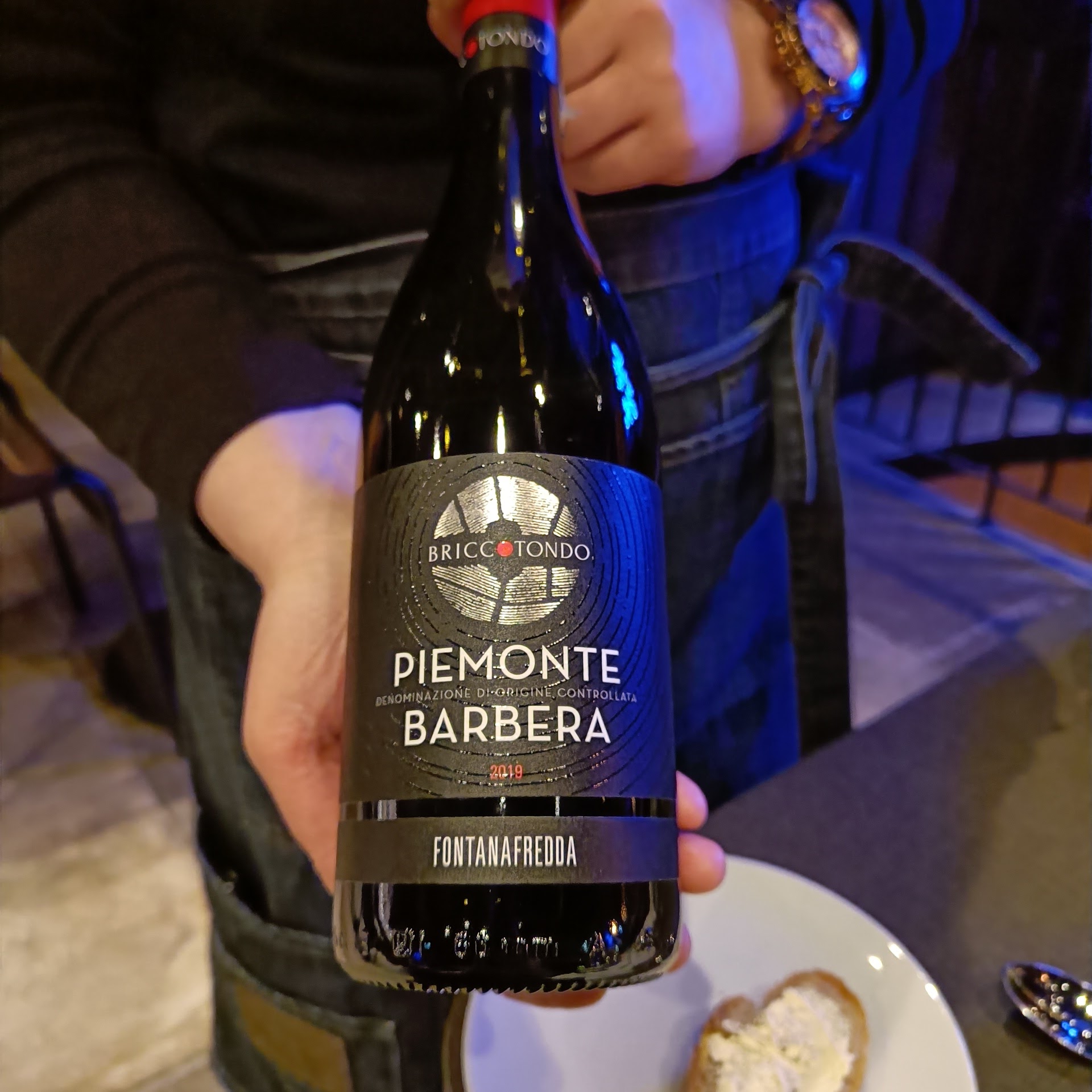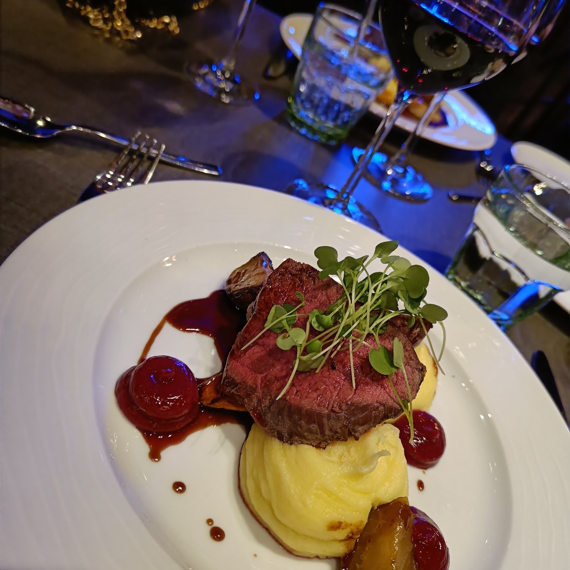 Pääruuaksi oli tarjolla grillattua Inarin poron vasikan sisäpaistia, puolukkaa, muusia ja juureksia. Oih, poro oli ihanan pehmeää ja suussa sulavaa, muusi kermaisen herkullista ja se puolukkka – luulin aluksi, että lautasellani on ketsuppia, mutta ei, se oli pehmeän makeaa puolukkasurvosta. Täydellistä! Pääruuan kruunasi vielä Fontanafreddan Organic Barbera d’Asti, jonka makeat marjat ja pehmeät tanniinit vastasivat hyvin puolukan kirpeydelle ja poron proteiineille.