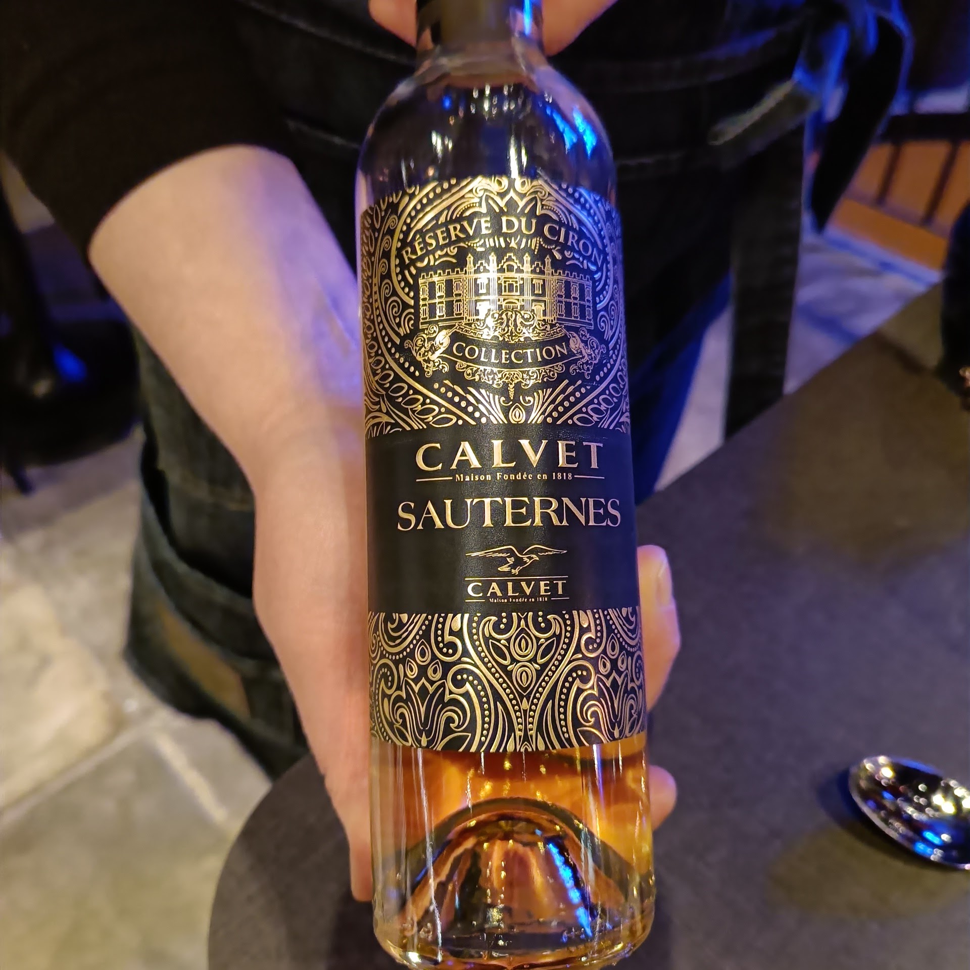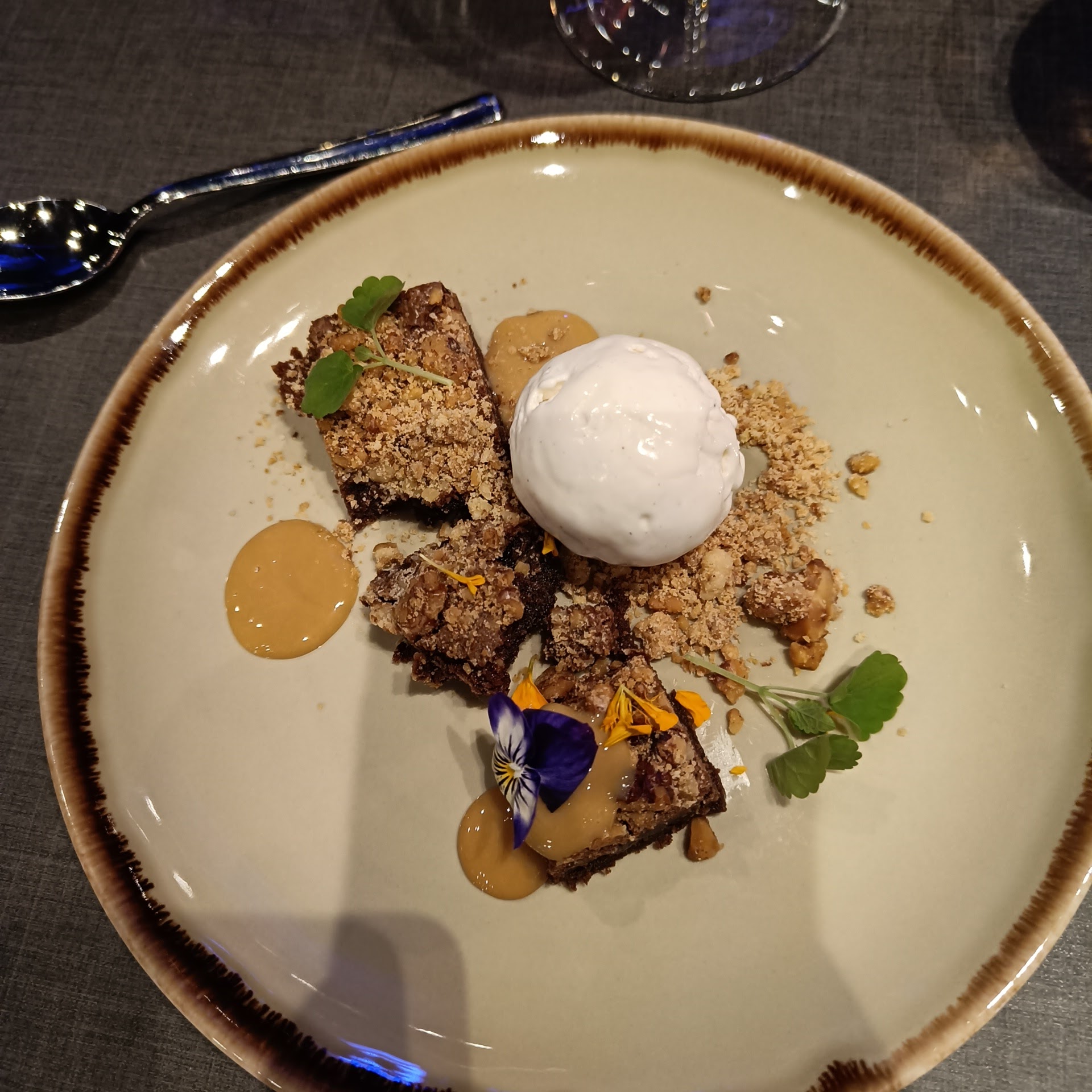 Jälkiruuaksi oli kaunis kokonaisuus browniesia, vaniljajäätelöä ja suolakinuskia. Söpön pieni annos, joka ei vienyt makeudellaan tärviölle kuten yleensä jälkiruuissa käy. Söpölle jälkiruualle oli valittu myös söpö jälkiruokaviini Calvet Réserve du Siron Sauternes, jonka hedelmäinen makeus tasapainotti suolakinuskin makeutta.