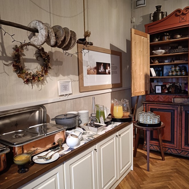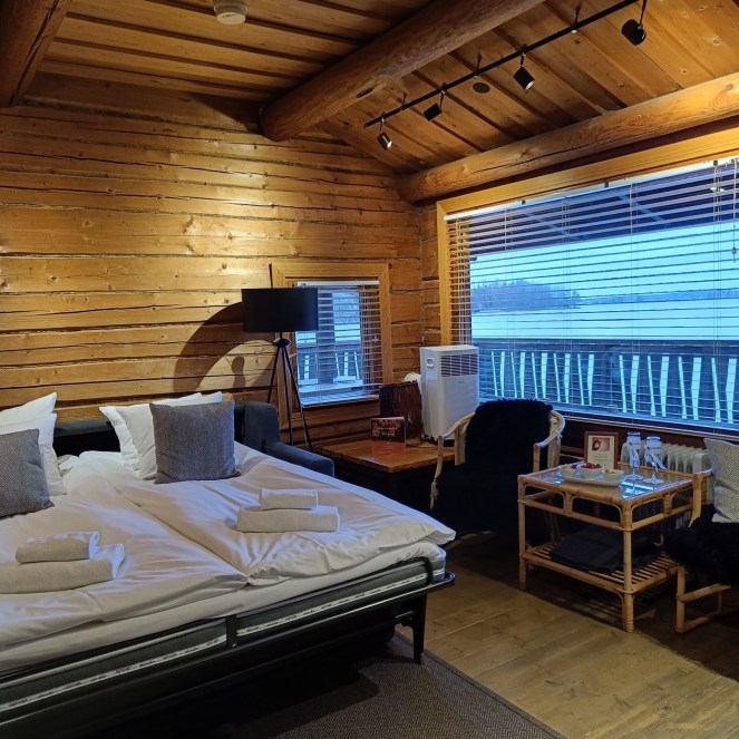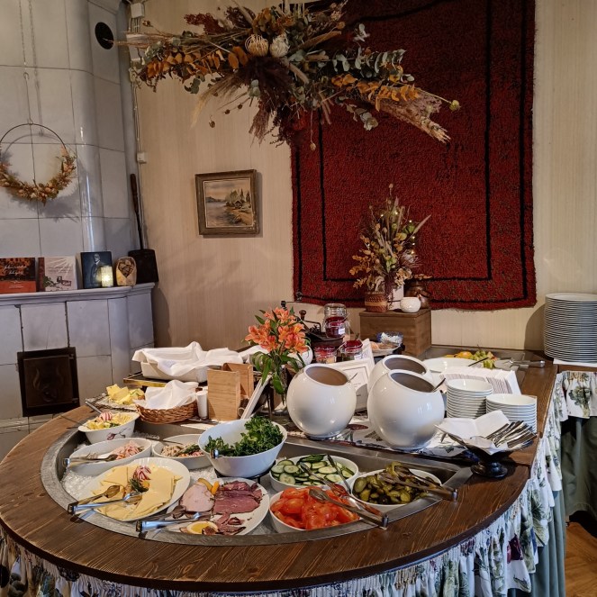Aamu kuitenkin koitti liian nopeasti emmekä millään olisi halunneet luopua mökin turvallisesta lämmöstä ja ikkunan takaa avautuvasta upeasta maisemasta. Oli aika siirtyä aamupalalle Krapihoviin, jossa odotti herkullisen runsas aamupalabuffet. Jonka jälkeen tuli aika palata kotiin ja arkeen.