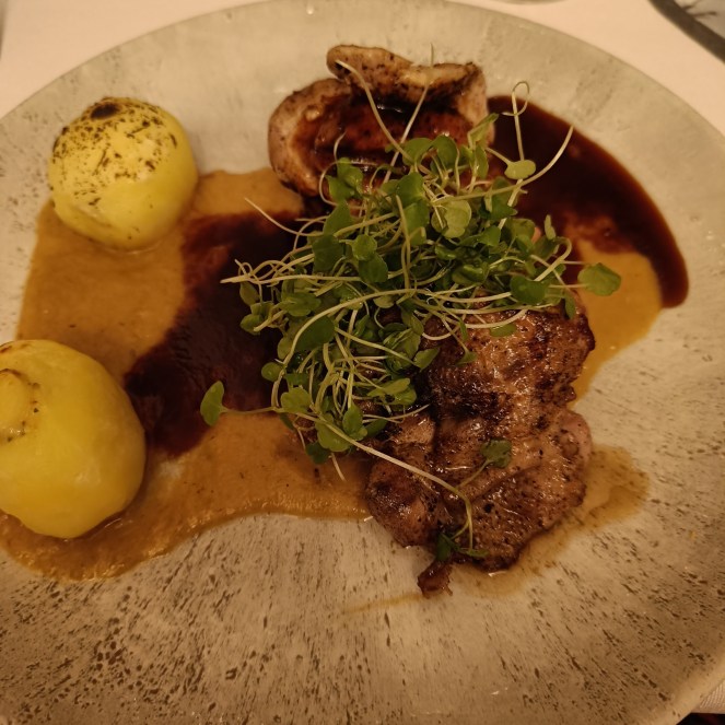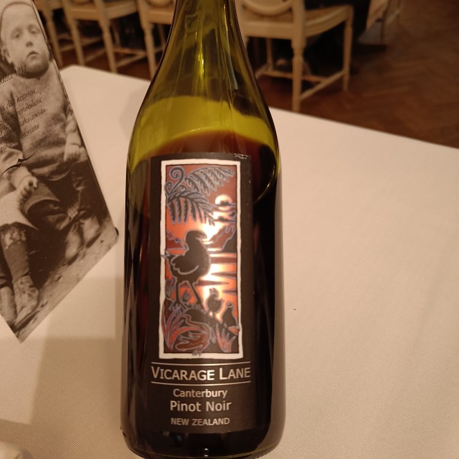 - Pääruoaksi valitsimme paahdettua ja haudutettua peltopyytä, uuniomena-sipulipyrettä, kastanjaperunaa ja pihlajanmarjakastiketta. Täydelliselle ruoalle löytyi myös täydellinen pari viineistä, nimittäin Vicarage Lane Canterbury Pinot Noir.